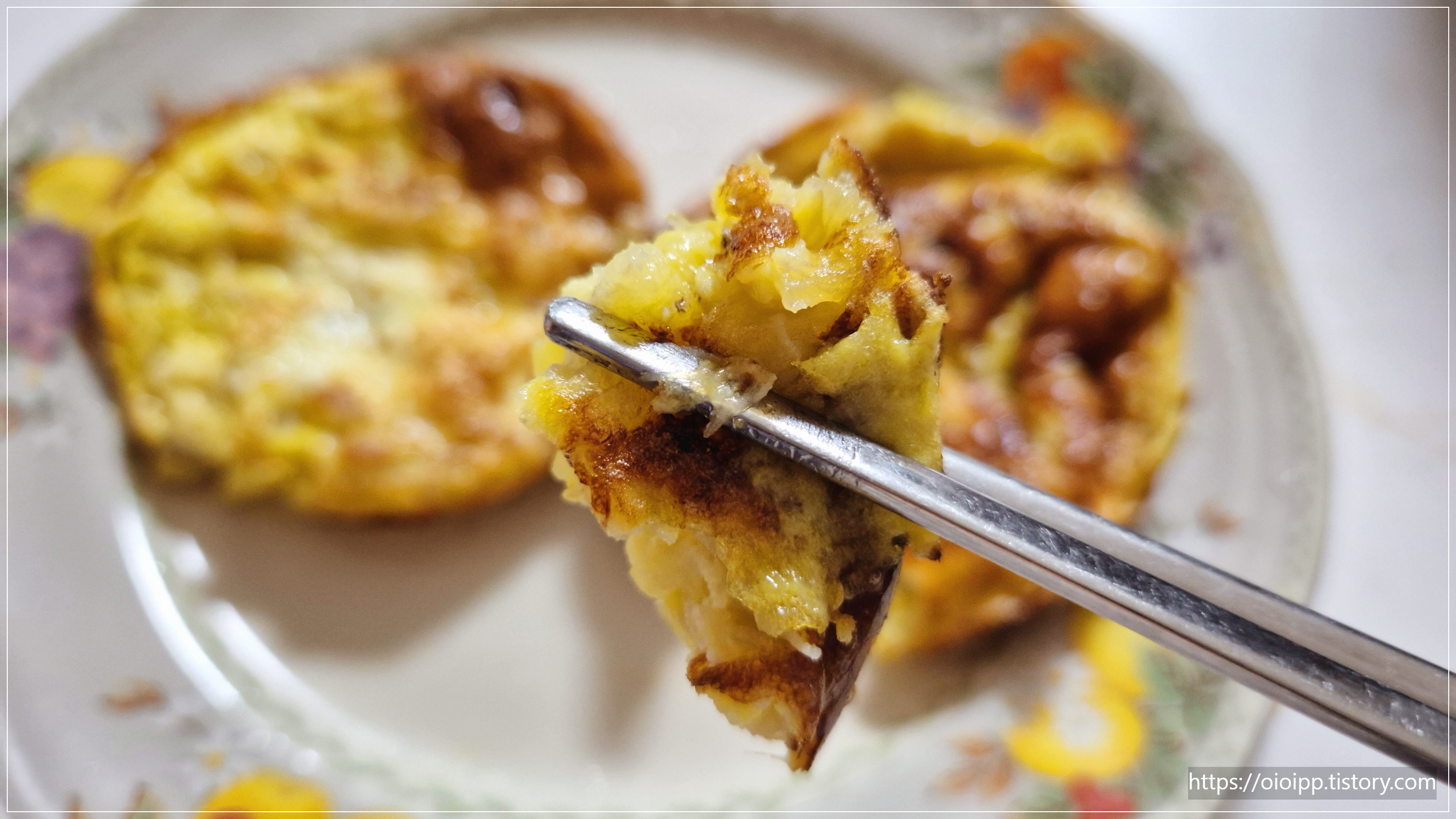 혼자 먹을 것이라 계란1개, 바나나 반개를 그릇에 섞었어요. 바나나는 으깬 후 계란과 섞어주면 됩니다. 밀가루가 안 들어가서 건강한 요리로 추천하는데요. 기호에 따라 소금을 조금 섞어서 간을 해줘도 좋아요. 바나나 만으로도 충분히 달달한 맛이 나서 저는 소금간은 따로 안 했습니다.