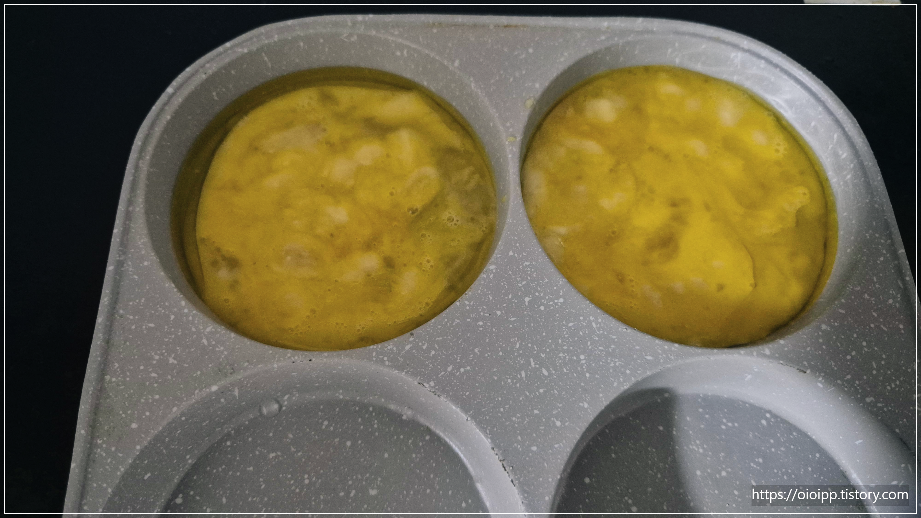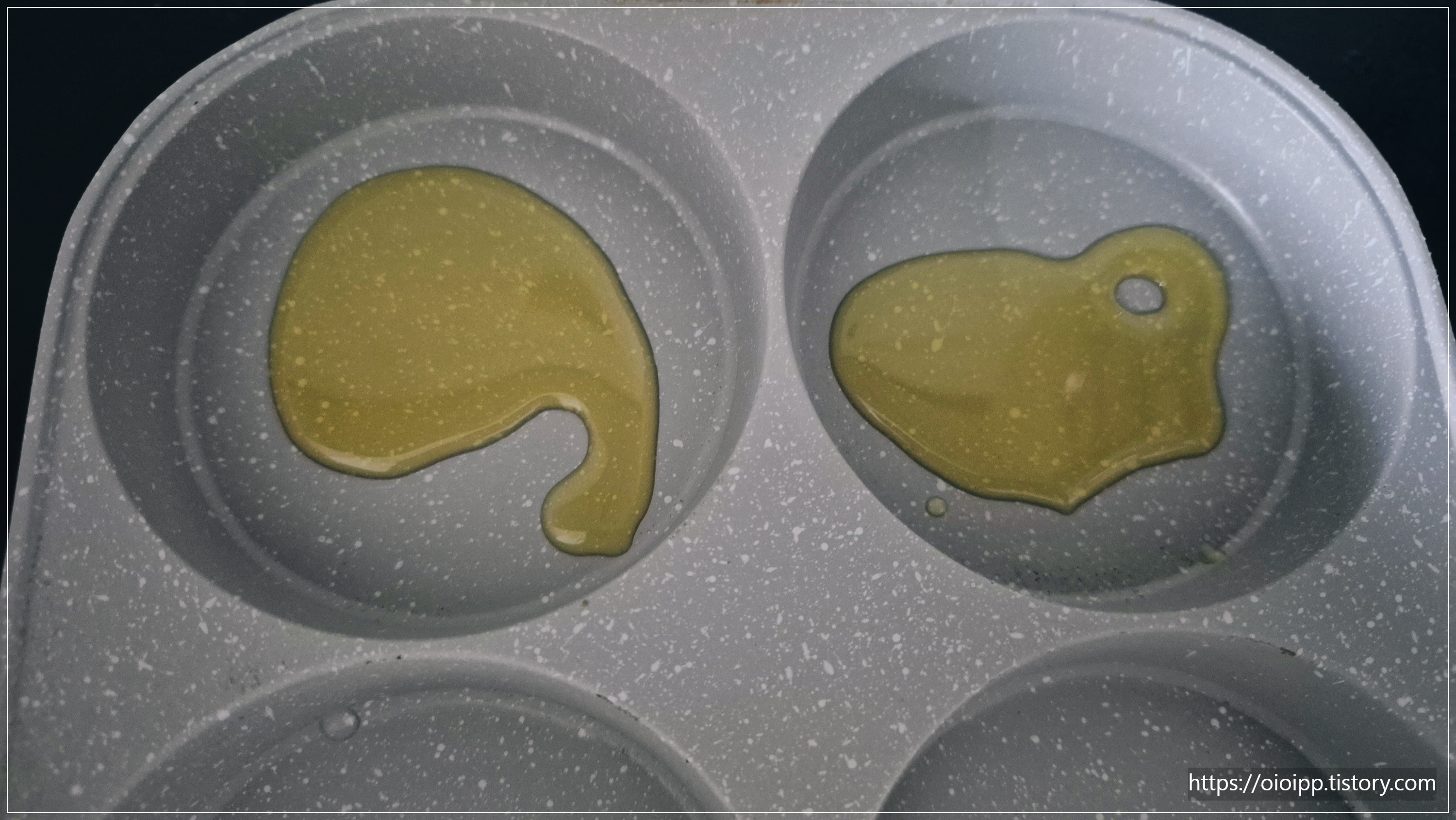 4구 후라이펜에 기름을 사진과 같이 두르고 좀 전에 섞었던 계란과 바나나를 넣어요.