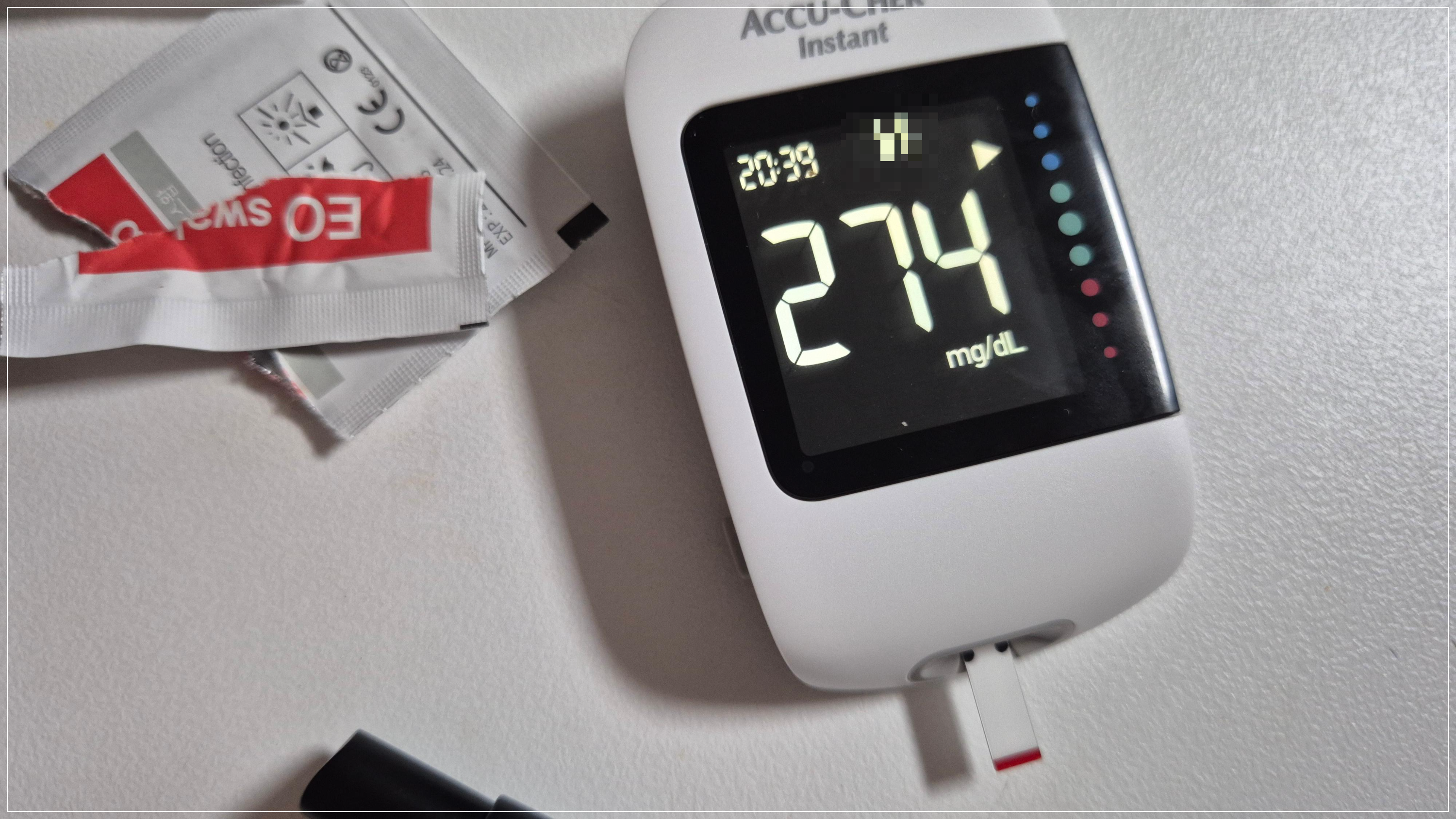 리브레2 착용 전 쟀던 혈당이에요. 흰쌀에 일반 반찬을 먹고 식후 2시간 혈당이에요. 274?! 깜짝놀랐어요. 이때는 당뇨를 안지 며칠 안되던 때였어요. 지금은 식당과 운동을 병행하며 당뇨 관리를 해서 혈당이 많이 호전됐어요.