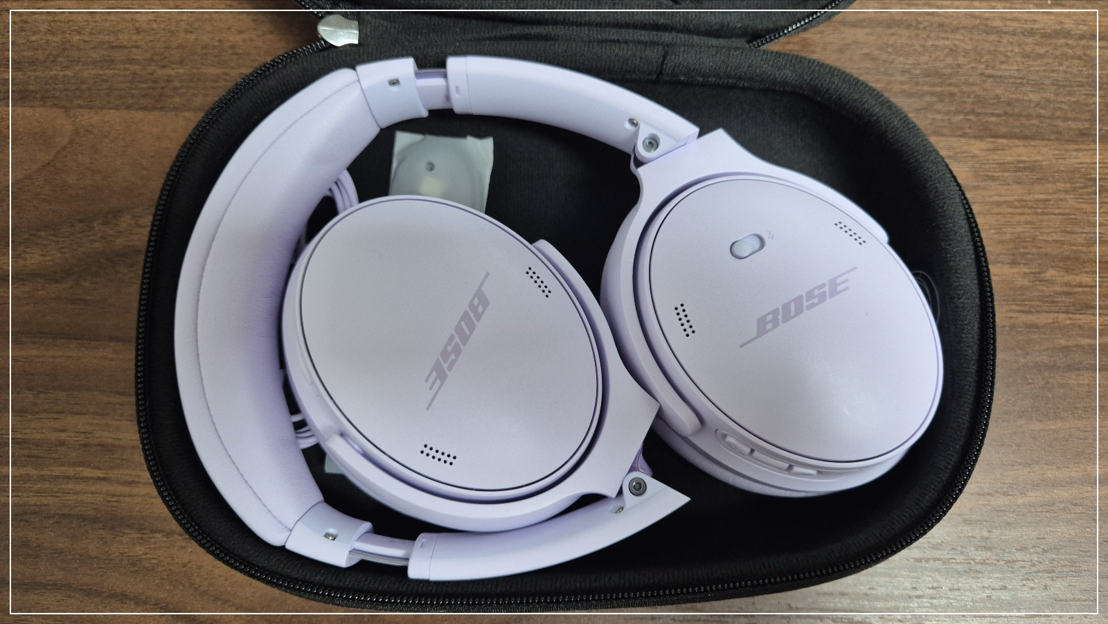 보통 헤드폰은 안 접히는 게 많잖아요? 보스 QC 헤드폰 연보라색은 양쪽 귀걸이가 회전형으로 접힙니다. 접히는 부분이 매우 부드럽습니다.